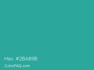 Hex #2ba89b Color is a normal cyan color and the nearest color is Keppel #3ab09e. Hex code #2ba89b and RGB value is rgb(43,168,155). In RGB color space, this color is composed of 17% red, 66% green, 61% blue, In CMYK color space, this color is composed of 74% cyan, 0% magenta, 8% yellow , 34% black , In HSL color space, this color has a hue angle of 174° , 59% saturation and 41% lightness.