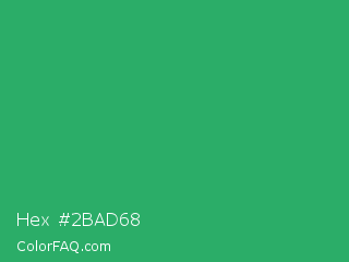 Hex #2bad68 Color is a normal green color and the nearest color is Medium Sea Green #3cb371. Hex code #2bad68 and RGB value is rgb(43,173,104). In RGB color space, this color is composed of 17% red, 68% green, 41% blue, In CMYK color space, this color is composed of 75% cyan, 0% magenta, 40% yellow , 32% black , In HSL color space, this color has a hue angle of 148° , 60% saturation and 42% lightness.