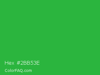 Hex #2bb53e Color is a normal green color and the nearest color is Wageningen Green #34b233. Hex code #2bb53e and RGB value is rgb(43,181,62). In RGB color space, this color is composed of 17% red, 71% green, 24% blue, In CMYK color space, this color is composed of 76% cyan, 0% magenta, 66% yellow , 29% black , In HSL color space, this color has a hue angle of 128° , 62% saturation and 44% lightness.