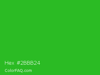 Hex #2bbb24 Color is a normal green color and the nearest color is Wageningen Green #34b233. Hex code #2bbb24 and RGB value is rgb(43,187,36). In RGB color space, this color is composed of 17% red, 73% green, 14% blue, In CMYK color space, this color is composed of 77% cyan, 0% magenta, 81% yellow , 27% black , In HSL color space, this color has a hue angle of 117° , 68% saturation and 44% lightness.