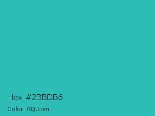 Hex #2bbdb6 Color is a normal cyan color and the nearest color is Maximum Blue Green #30bfbf. Hex code #2bbdb6 and RGB value is rgb(43,189,182). In RGB color space, this color is composed of 17% red, 74% green, 71% blue, In CMYK color space, this color is composed of 77% cyan, 0% magenta, 4% yellow , 26% black , In HSL color space, this color has a hue angle of 177° , 63% saturation and 45% lightness.