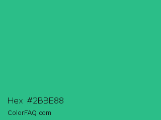Hex #2bbe88 Color is a normal green color and the nearest color is Mountain Meadow #30ba8f. Hex code #2bbe88 and RGB value is rgb(43,190,136). In RGB color space, this color is composed of 17% red, 75% green, 53% blue, In CMYK color space, this color is composed of 77% cyan, 0% magenta, 28% yellow , 25% black , In HSL color space, this color has a hue angle of 158° , 63% saturation and 46% lightness.
