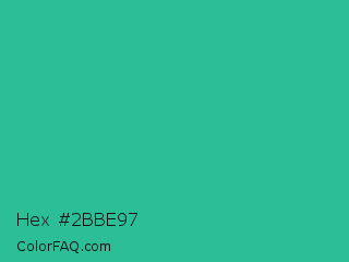 Hex #2bbe97 Color is a normal cyan color and the nearest color is Mountain Meadow #30ba8f. Hex code #2bbe97 and RGB value is rgb(43,190,151). In RGB color space, this color is composed of 17% red, 75% green, 59% blue, In CMYK color space, this color is composed of 77% cyan, 0% magenta, 21% yellow , 25% black , In HSL color space, this color has a hue angle of 164° , 63% saturation and 46% lightness.