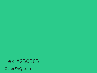 Hex #2bcb8b Color is a normal green color and the nearest color is Shamrock #33cc99. Hex code #2bcb8b and RGB value is rgb(43,203,139). In RGB color space, this color is composed of 17% red, 80% green, 55% blue, In CMYK color space, this color is composed of 79% cyan, 0% magenta, 32% yellow , 20% black , In HSL color space, this color has a hue angle of 156° , 65% saturation and 48% lightness.