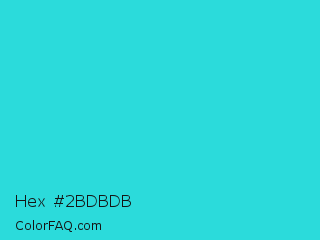 Hex #2bdbdb Color is a normal cyan color and the nearest color is Turquoise PWG #30d5c8. Hex code #2bdbdb and RGB value is rgb(43,219,219). In RGB color space, this color is composed of 17% red, 86% green, 86% blue, In CMYK color space, this color is composed of 80% cyan, 0% magenta, 0% yellow , 14% black , In HSL color space, this color has a hue angle of 180° , 71% saturation and 51% lightness.