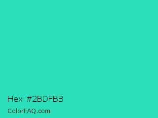 Hex #2bdfbb Color is a normal cyan color and the nearest color is Turquoise PWG #30d5c8. Hex code #2bdfbb and RGB value is rgb(43,223,187). In RGB color space, this color is composed of 17% red, 87% green, 73% blue, In CMYK color space, this color is composed of 81% cyan, 0% magenta, 16% yellow , 13% black , In HSL color space, this color has a hue angle of 168° , 74% saturation and 52% lightness.