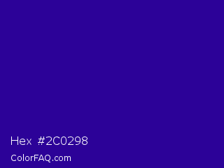 Hex #2c0298 Color is a dark indigo color and the nearest color is Blue Gem #2c0e8c. Hex code #2c0298 and RGB value is rgb(44,2,152). In RGB color space, this color is composed of 17% red, 1% green, 60% blue, In CMYK color space, this color is composed of 71% cyan, 99% magenta, 0% yellow , 40% black , In HSL color space, this color has a hue angle of 257° , 97% saturation and 30% lightness.