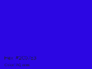 Hex #2c07e3 Color is a normal indigo color and the nearest color is Interdimensional Blue #360ccc. Hex code #2c07e3 and RGB value is rgb(44,7,227). In RGB color space, this color is composed of 17% red, 3% green, 89% blue, In CMYK color space, this color is composed of 81% cyan, 97% magenta, 0% yellow , 11% black , In HSL color space, this color has a hue angle of 250° , 94% saturation and 46% lightness.