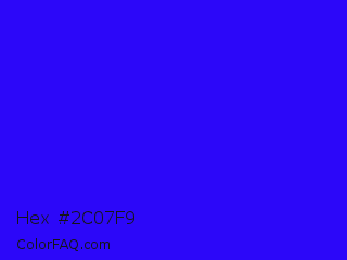 Hex #2c07f9 Color is a normal indigo color and the nearest color is Electric Ultramarine #3f00ff. Hex code #2c07f9 and RGB value is rgb(44,7,249). In RGB color space, this color is composed of 17% red, 3% green, 98% blue, In CMYK color space, this color is composed of 82% cyan, 97% magenta, 0% yellow , 2% black , In HSL color space, this color has a hue angle of 249° , 95% saturation and 50% lightness.