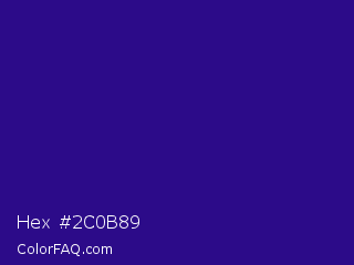 Hex #2c0b89 Color is a dark indigo color and the nearest color is Blue Gem #2c0e8c. Hex code #2c0b89 and RGB value is rgb(44,11,137). In RGB color space, this color is composed of 17% red, 4% green, 54% blue, In CMYK color space, this color is composed of 68% cyan, 92% magenta, 0% yellow , 46% black , In HSL color space, this color has a hue angle of 256° , 85% saturation and 29% lightness.