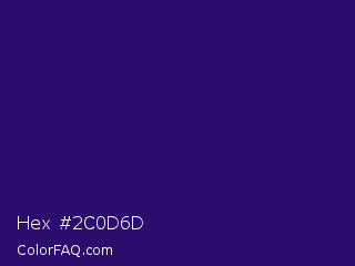 Hex #2c0d6d Color is a dark indigo color and the nearest color is Paris M #26056a. Hex code #2c0d6d and RGB value is rgb(44,13,109). In RGB color space, this color is composed of 17% red, 5% green, 43% blue, In CMYK color space, this color is composed of 60% cyan, 88% magenta, 0% yellow , 57% black , In HSL color space, this color has a hue angle of 259° , 79% saturation and 24% lightness.