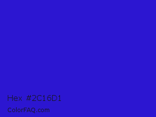 Hex #2c16d1 Color is a normal indigo color and the nearest color is Interdimensional Blue #360ccc. Hex code #2c16d1 and RGB value is rgb(44,22,209). In RGB color space, this color is composed of 17% red, 9% green, 82% blue, In CMYK color space, this color is composed of 79% cyan, 89% magenta, 0% yellow , 18% black , In HSL color space, this color has a hue angle of 247° , 81% saturation and 45% lightness.