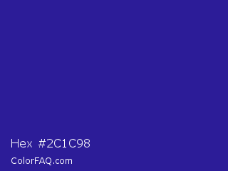 Hex #2c1c98 Color is a normal indigo color and the nearest color is Jacksons Purple #20208d. Hex code #2c1c98 and RGB value is rgb(44,28,152). In RGB color space, this color is composed of 17% red, 11% green, 60% blue, In CMYK color space, this color is composed of 71% cyan, 82% magenta, 0% yellow , 40% black , In HSL color space, this color has a hue angle of 248° , 69% saturation and 35% lightness.