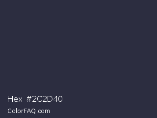 Hex #2c2d40 Color is a very dark blue color and the nearest color is Ebony Clay #26283b. Hex code #2c2d40 and RGB value is rgb(44,45,64). In RGB color space, this color is composed of 17% red, 18% green, 25% blue, In CMYK color space, this color is composed of 31% cyan, 30% magenta, 0% yellow , 75% black , In HSL color space, this color has a hue angle of 237° , 19% saturation and 21% lightness.