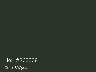 Hex #2c3328 Color is a very dark green color and the nearest color is Heavy Metal #2b3228. Hex code #2c3328 and RGB value is rgb(44,51,40). In RGB color space, this color is composed of 17% red, 20% green, 16% blue, In CMYK color space, this color is composed of 14% cyan, 0% magenta, 22% yellow , 80% black , In HSL color space, this color has a hue angle of 98° , 12% saturation and 18% lightness.