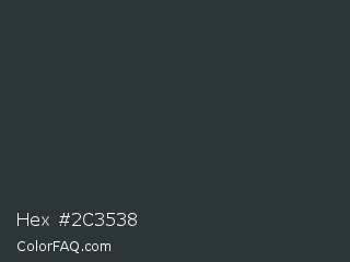Hex #2c3538 Color is a very dark blue color and the nearest color is Gunmetal #2a3439. Hex code #2c3538 and RGB value is rgb(44,53,56). In RGB color space, this color is composed of 17% red, 21% green, 22% blue, In CMYK color space, this color is composed of 21% cyan, 5% magenta, 0% yellow , 78% black , In HSL color space, this color has a hue angle of 195° , 12% saturation and 20% lightness.