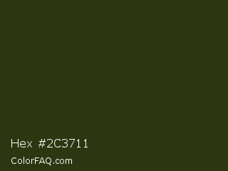 Hex #2c3711 Color is a very dark lime color and the nearest color is Turtle Green #2a380b. Hex code #2c3711 and RGB value is rgb(44,55,17). In RGB color space, this color is composed of 17% red, 22% green, 7% blue, In CMYK color space, this color is composed of 20% cyan, 0% magenta, 69% yellow , 78% black , In HSL color space, this color has a hue angle of 77° , 53% saturation and 14% lightness.