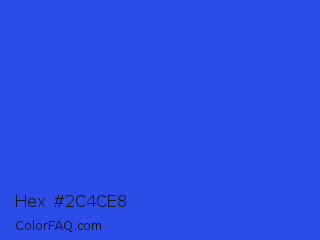 Hex #2c4ce8 Color is a normal blue color and the nearest color is Palatinate Blue #273be2. Hex code #2c4ce8 and RGB value is rgb(44,76,232). In RGB color space, this color is composed of 17% red, 30% green, 91% blue, In CMYK color space, this color is composed of 81% cyan, 67% magenta, 0% yellow , 9% black , In HSL color space, this color has a hue angle of 230° , 80% saturation and 54% lightness.