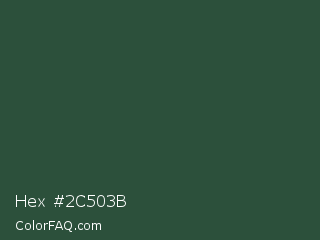 Hex #2c503b Color is a dark green color and the nearest color is Hunter Green #355e3b. Hex code #2c503b and RGB value is rgb(44,80,59). In RGB color space, this color is composed of 17% red, 31% green, 23% blue, In CMYK color space, this color is composed of 45% cyan, 0% magenta, 26% yellow , 69% black , In HSL color space, this color has a hue angle of 145° , 29% saturation and 24% lightness.