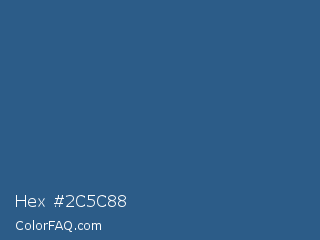 Hex #2c5c88 Color is a normal blue color and the nearest color is B Dazzled Blue #2e5894. Hex code #2c5c88 and RGB value is rgb(44,92,136). In RGB color space, this color is composed of 17% red, 36% green, 53% blue, In CMYK color space, this color is composed of 68% cyan, 32% magenta, 0% yellow , 47% black , In HSL color space, this color has a hue angle of 209° , 51% saturation and 35% lightness.