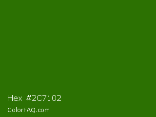 Hex #2c7102 Color is a dark green color and the nearest color is Napier Green #2a8000. Hex code #2c7102 and RGB value is rgb(44,113,2). In RGB color space, this color is composed of 17% red, 44% green, 1% blue, In CMYK color space, this color is composed of 61% cyan, 0% magenta, 98% yellow , 56% black , In HSL color space, this color has a hue angle of 97° , 97% saturation and 23% lightness.