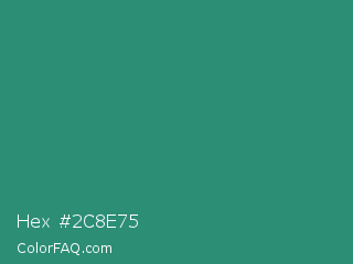 Hex #2c8e75 Color is a normal cyan color and the nearest color is Illuminating Emerald #319177. Hex code #2c8e75 and RGB value is rgb(44,142,117). In RGB color space, this color is composed of 17% red, 56% green, 46% blue, In CMYK color space, this color is composed of 69% cyan, 0% magenta, 18% yellow , 44% black , In HSL color space, this color has a hue angle of 165° , 53% saturation and 36% lightness.