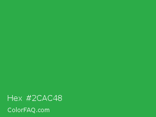 Hex #2cac48 Color is a normal green color and the nearest color is Wageningen Green #34b233. Hex code #2cac48 and RGB value is rgb(44,172,72). In RGB color space, this color is composed of 17% red, 67% green, 28% blue, In CMYK color space, this color is composed of 74% cyan, 0% magenta, 58% yellow , 33% black , In HSL color space, this color has a hue angle of 133° , 59% saturation and 42% lightness.