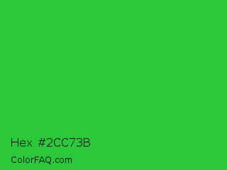 Hex #2cc73b Color is a normal green color and the nearest color is Lime Green #32cd32. Hex code #2cc73b and RGB value is rgb(44,199,59). In RGB color space, this color is composed of 17% red, 78% green, 23% blue, In CMYK color space, this color is composed of 78% cyan, 0% magenta, 70% yellow , 22% black , In HSL color space, this color has a hue angle of 126° , 64% saturation and 48% lightness.