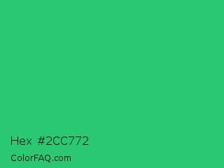Hex #2cc772 Color is a normal green color and the nearest color is UFO Green #3cd070. Hex code #2cc772 and RGB value is rgb(44,199,114). In RGB color space, this color is composed of 17% red, 78% green, 45% blue, In CMYK color space, this color is composed of 78% cyan, 0% magenta, 43% yellow , 22% black , In HSL color space, this color has a hue angle of 147° , 64% saturation and 48% lightness.