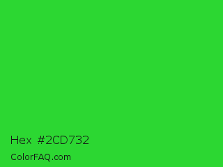 Hex #2cd732 Color is a normal green color and the nearest color is Lime Green #32cd32. Hex code #2cd732 and RGB value is rgb(44,215,50). In RGB color space, this color is composed of 17% red, 84% green, 20% blue, In CMYK color space, this color is composed of 80% cyan, 0% magenta, 77% yellow , 16% black , In HSL color space, this color has a hue angle of 122° , 68% saturation and 51% lightness.