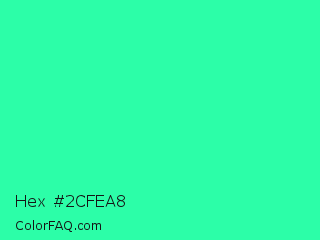 Hex #2cfea8 Color is a normal green color and the nearest color is Eucalyptus #44d7a8. Hex code #2cfea8 and RGB value is rgb(44,254,168). In RGB color space, this color is composed of 17% red, 100% green, 66% blue, In CMYK color space, this color is composed of 83% cyan, 0% magenta, 34% yellow , 0% black , In HSL color space, this color has a hue angle of 155° , 99% saturation and 58% lightness.