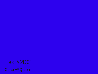 Hex #2d01ee Color is a normal indigo color and the nearest color is Electric Ultramarine #3f00ff. Hex code #2d01ee and RGB value is rgb(45,1,238). In RGB color space, this color is composed of 18% red, 0% green, 93% blue, In CMYK color space, this color is composed of 81% cyan, 100% magenta, 0% yellow , 7% black , In HSL color space, this color has a hue angle of 251° , 99% saturation and 47% lightness.