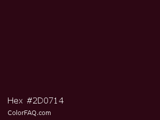 Hex #2d0714 Color is a very dark rose color and the nearest color is Coffee Bean #2a140e. Hex code #2d0714 and RGB value is rgb(45,7,20). In RGB color space, this color is composed of 18% red, 3% green, 8% blue, In CMYK color space, this color is composed of 0% cyan, 84% magenta, 56% yellow , 82% black , In HSL color space, this color has a hue angle of 339° , 73% saturation and 10% lightness.