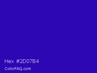 Hex #2d07b4 Color is a normal indigo color and the nearest color is Interdimensional Blue #360ccc. Hex code #2d07b4 and RGB value is rgb(45,7,180). In RGB color space, this color is composed of 18% red, 3% green, 71% blue, In CMYK color space, this color is composed of 75% cyan, 96% magenta, 0% yellow , 29% black , In HSL color space, this color has a hue angle of 253° , 93% saturation and 37% lightness.