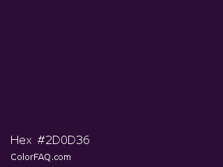 Hex #2d0d36 Color is a very dark purple color and the nearest color is Revolver #2c1632. Hex code #2d0d36 and RGB value is rgb(45,13,54). In RGB color space, this color is composed of 18% red, 5% green, 21% blue, In CMYK color space, this color is composed of 17% cyan, 76% magenta, 0% yellow , 79% black , In HSL color space, this color has a hue angle of 287° , 61% saturation and 13% lightness.