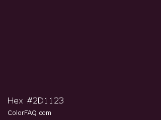 Hex #2d1123 Color is a very dark magenta color and the nearest color is Melanzane #300529. Hex code #2d1123 and RGB value is rgb(45,17,35). In RGB color space, this color is composed of 18% red, 7% green, 14% blue, In CMYK color space, this color is composed of 0% cyan, 62% magenta, 22% yellow , 82% black , In HSL color space, this color has a hue angle of 321° , 45% saturation and 12% lightness.