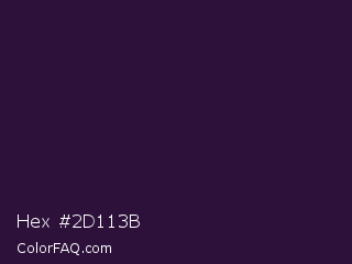 Hex #2d113b Color is a very dark purple color and the nearest color is Revolver #2c1632. Hex code #2d113b and RGB value is rgb(45,17,59). In RGB color space, this color is composed of 18% red, 7% green, 23% blue, In CMYK color space, this color is composed of 24% cyan, 71% magenta, 0% yellow , 77% black , In HSL color space, this color has a hue angle of 280° , 55% saturation and 15% lightness.