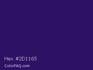 Hex #2d1165 Color is a dark indigo color and the nearest color is Violent Violet #290c5e. Hex code #2d1165 and RGB value is rgb(45,17,101). In RGB color space, this color is composed of 18% red, 7% green, 40% blue, In CMYK color space, this color is composed of 55% cyan, 83% magenta, 0% yellow , 60% black , In HSL color space, this color has a hue angle of 260° , 71% saturation and 23% lightness.