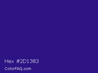Hex #2d1383 Color is a dark indigo color and the nearest color is Blue Gem #2c0e8c. Hex code #2d1383 and RGB value is rgb(45,19,131). In RGB color space, this color is composed of 18% red, 7% green, 51% blue, In CMYK color space, this color is composed of 66% cyan, 85% magenta, 0% yellow , 49% black , In HSL color space, this color has a hue angle of 254° , 75% saturation and 29% lightness.