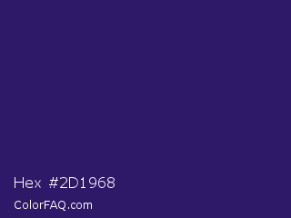 Hex #2d1968 Color is a dark indigo color and the nearest color is Violent Violet #290c5e. Hex code #2d1968 and RGB value is rgb(45,25,104). In RGB color space, this color is composed of 18% red, 10% green, 41% blue, In CMYK color space, this color is composed of 57% cyan, 76% magenta, 0% yellow , 59% black , In HSL color space, this color has a hue angle of 255° , 61% saturation and 25% lightness.