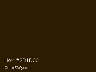 Hex #2d1d00 Color is a almost black orange color and the nearest color is Jacko Bean #2e1905. Hex code #2d1d00 and RGB value is rgb(45,29,0). In RGB color space, this color is composed of 18% red, 11% green, 0% blue, In CMYK color space, this color is composed of 0% cyan, 36% magenta, 100% yellow , 82% black , In HSL color space, this color has a hue angle of 39° , 100% saturation and 9% lightness.