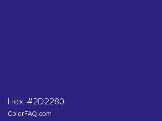 Hex #2d2280 Color is a normal indigo color and the nearest color is St Patricks Blue #23297a. Hex code #2d2280 and RGB value is rgb(45,34,128). In RGB color space, this color is composed of 18% red, 13% green, 50% blue, In CMYK color space, this color is composed of 65% cyan, 73% magenta, 0% yellow , 50% black , In HSL color space, this color has a hue angle of 247° , 58% saturation and 32% lightness.