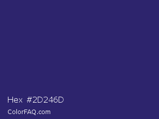 Hex #2d246d Color is a dark indigo color and the nearest color is Jacarta #3a2a6a. Hex code #2d246d and RGB value is rgb(45,36,109). In RGB color space, this color is composed of 18% red, 14% green, 43% blue, In CMYK color space, this color is composed of 59% cyan, 67% magenta, 0% yellow , 57% black , In HSL color space, this color has a hue angle of 247° , 50% saturation and 28% lightness.