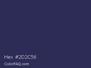 Hex #2d2c56 Color is a dark indigo color and the nearest color is Martinique #363050. Hex code #2d2c56 and RGB value is rgb(45,44,86). In RGB color space, this color is composed of 18% red, 17% green, 34% blue, In CMYK color space, this color is composed of 48% cyan, 49% magenta, 0% yellow , 66% black , In HSL color space, this color has a hue angle of 241° , 32% saturation and 25% lightness.