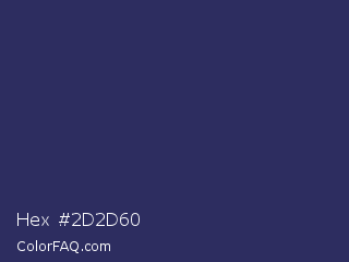 Hex #2d2d60 Color is a dark blue color and the nearest color is Deep Koamaru #333366. Hex code #2d2d60 and RGB value is rgb(45,45,96). In RGB color space, this color is composed of 18% red, 18% green, 38% blue, In CMYK color space, this color is composed of 53% cyan, 53% magenta, 0% yellow , 62% black , In HSL color space, this color has a hue angle of 240° , 36% saturation and 28% lightness.