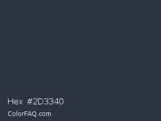 Hex #2d3340 Color is a very dark blue color and the nearest color is Gunmetal #2a3439. Hex code #2d3340 and RGB value is rgb(45,51,64). In RGB color space, this color is composed of 18% red, 20% green, 25% blue, In CMYK color space, this color is composed of 30% cyan, 20% magenta, 0% yellow , 75% black , In HSL color space, this color has a hue angle of 221° , 17% saturation and 21% lightness.