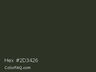 Hex #2d3426 Color is a very dark green color and the nearest color is Heavy Metal #2b3228. Hex code #2d3426 and RGB value is rgb(45,52,38). In RGB color space, this color is composed of 18% red, 20% green, 15% blue, In CMYK color space, this color is composed of 13% cyan, 0% magenta, 27% yellow , 80% black , In HSL color space, this color has a hue angle of 90° , 16% saturation and 18% lightness.