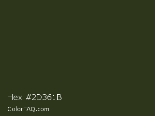 Hex #2d361b Color is a very dark green color and the nearest color is Rangitoto #2e3222. Hex code #2d361b and RGB value is rgb(45,54,27). In RGB color space, this color is composed of 18% red, 21% green, 11% blue, In CMYK color space, this color is composed of 17% cyan, 0% magenta, 50% yellow , 79% black , In HSL color space, this color has a hue angle of 80° , 33% saturation and 16% lightness.