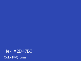 Hex #2d47b3 Color is a normal blue color and the nearest color is Violet Blue #324ab2. Hex code #2d47b3 and RGB value is rgb(45,71,179). In RGB color space, this color is composed of 18% red, 28% green, 70% blue, In CMYK color space, this color is composed of 75% cyan, 60% magenta, 0% yellow , 30% black , In HSL color space, this color has a hue angle of 228° , 60% saturation and 44% lightness.