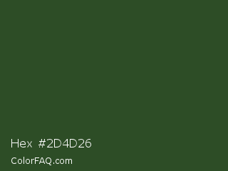 Hex #2d4d26 Color is a dark green color and the nearest color is Cal Poly Pomona Green #1e4d2b. Hex code #2d4d26 and RGB value is rgb(45,77,38). In RGB color space, this color is composed of 18% red, 30% green, 15% blue, In CMYK color space, this color is composed of 42% cyan, 0% magenta, 51% yellow , 70% black , In HSL color space, this color has a hue angle of 109° , 34% saturation and 23% lightness.